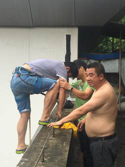 突击队员不畏艰险,继续抢险。要到达主馆的屋顶,需要从体育馆其他建筑的屋顶下降七米左右,现有的梯子不够长,需要用绳子把两把梯子接续起来才能下去。梯子的安全性不能保证,主馆屋顶积水的深度也未知,积水中还有电缆,雨还在一直在下,谁下去都面临着危险,考验大家的时刻到来了,但是谁也没有退缩。体育系党支部书记欧高志同志说:“我年轻,我上。”李铭同志说:“我有经验,还是我上。”入党积极分子朱文说:“我体力好,关键时刻,必须我上。”大家互不相让……