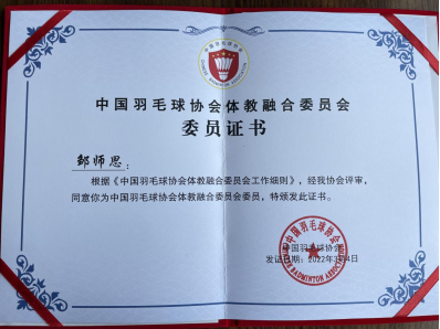 3月4日,中国羽毛球协会体教融合委员会成立大会在北京召开,北京大学、中国科学技术大学、中国地质大学(武汉)等87家单位成为会员单位(其中大学会员单位34家),我校beat365英国官网网站邹师思副教授当选为中国羽毛球协会体教融合委员会委员。